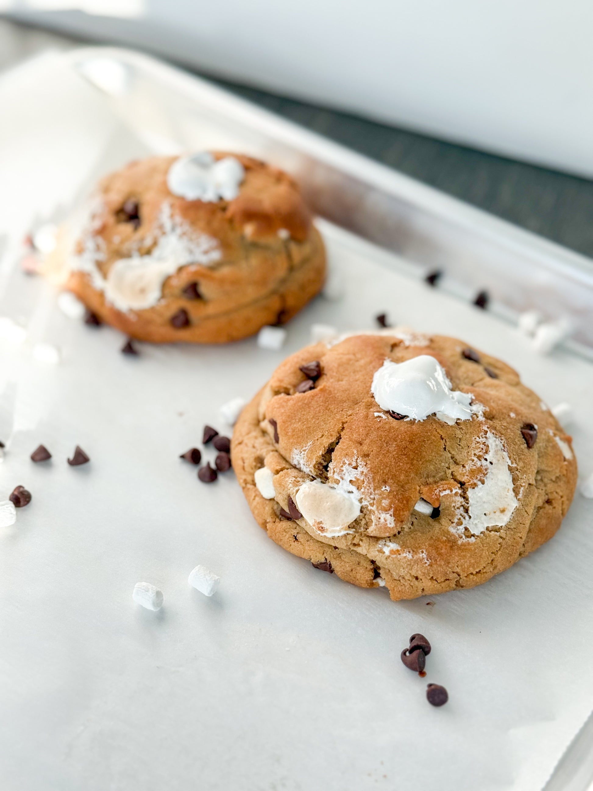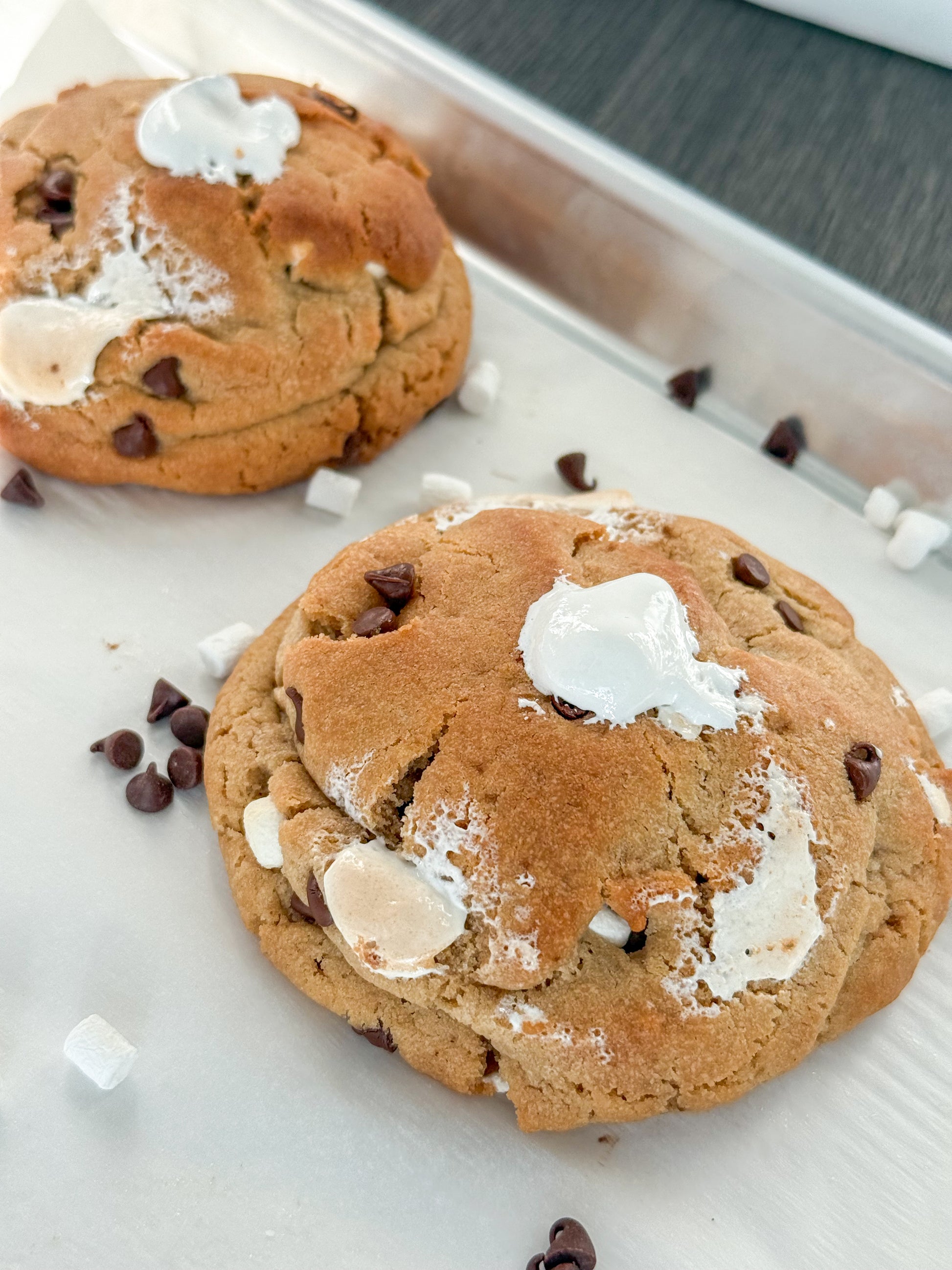 Get ready for a sweet adventure with our Fluffernutter cookie! This peanut butter cookie is swirled with marshmallow fluff, loaded with mini chocolate chips and mini marshmallows, and hides a gooey marshmallow fluff center. It’s the perfect playful mix of peanut butter, chocolate, and marshmallow magic in every bite!